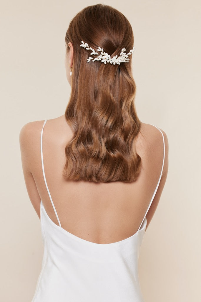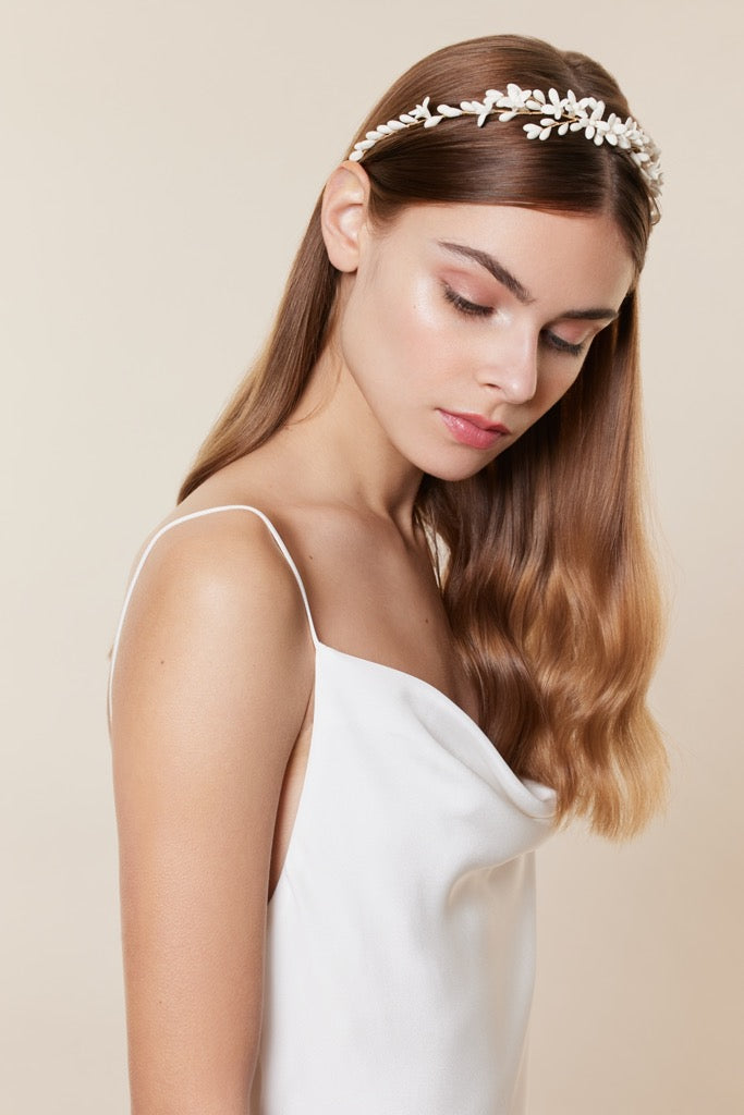 La Porcelaine froide qui compose les coiffes Maison Massillon est un savoir faire, une matière infiniment sensuelle et créative qui se façonne à la main, s’accumule en petites étincelles de lumière, ou de fleurs dans lesquelles chaque pétale de porcelaine prend sa forme définitive dans nos ateliers une fois modelée par le bombé de nos doigts.