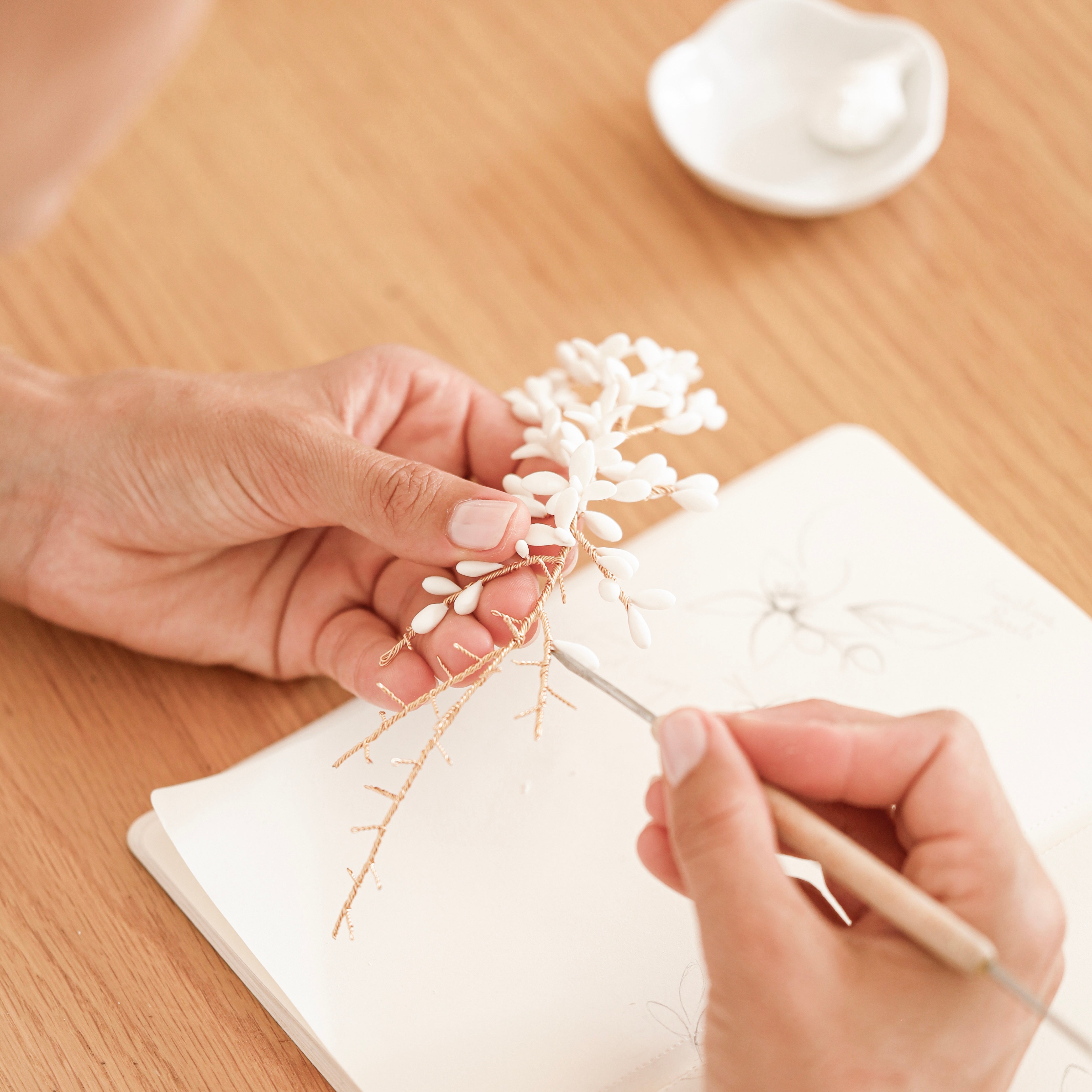 La créativité et le savoir-faire de la Maison s’exprime par ses motifs mais également par ses montures. Entièrement pensées et dessinées par Alizée Méhats à l’étape de croquis, les courbes des créations ne prennent vie qu’une fois la monture qui portera les motifs de porcelaine réalisée.
